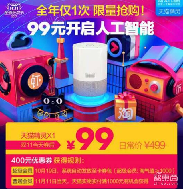 回到各家智能音箱备战双十一上,天猫精灵走在了头阵,在10月20日率先开启大促,所有淘宝超级会员都会收到一张购买天猫精灵的400元优惠券,而非超级会员用户在双十一当天购物满1000元,也可获得该优惠券,即可99元购买智能音箱。相对于天猫精灵499元的正常售价,99元还是很有吸引力的。