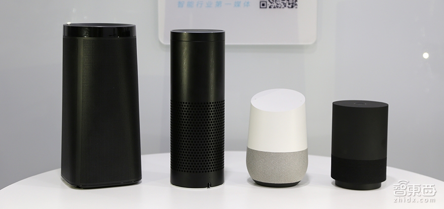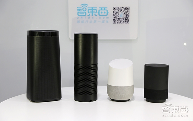 (从左依次为叮咚音箱A1、亚马逊Echo、Google Home、天猫精灵X1)