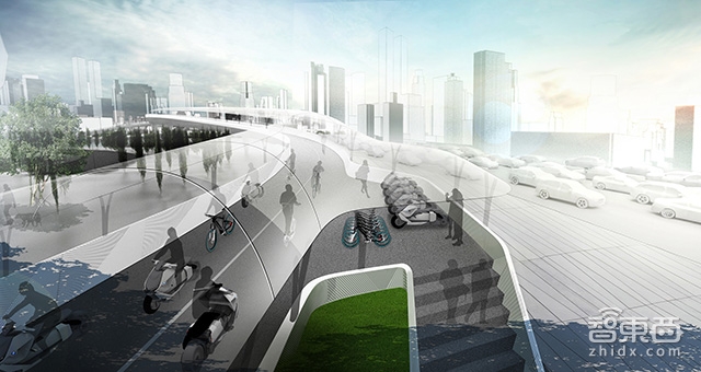 E³ Way的名字里其实并未提及出行,但实际上这套交通体系也考虑到了这一点,其在行人入口处的平台上会直接设有一个共享车辆停车场,行人上去后可直接租用两轮车辆。