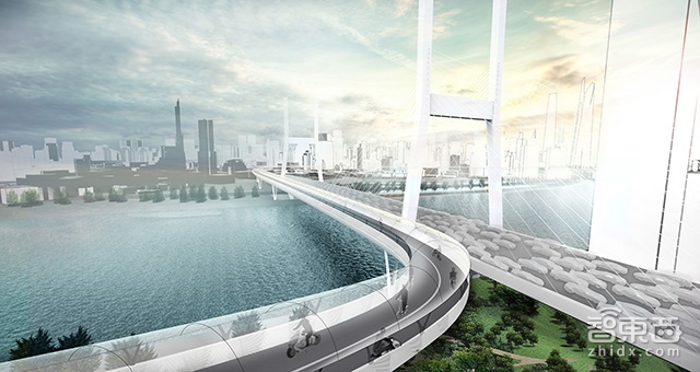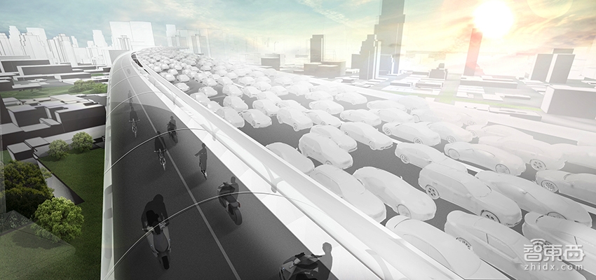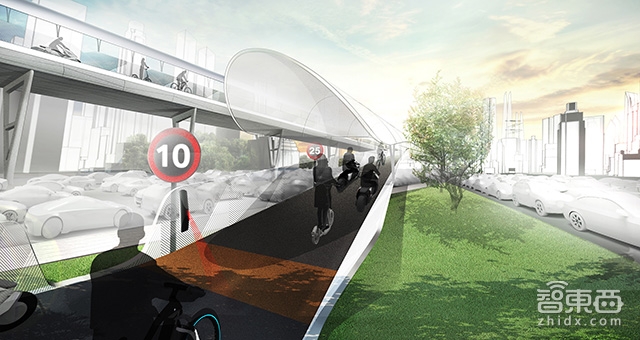 在这个高架的顶部有一个椭圆形的透明外壳,可以帮高架内的交通参与者遮风挡雨,在夏天的时候还会变色,帮助遮阳,从而让骑行更加舒适。