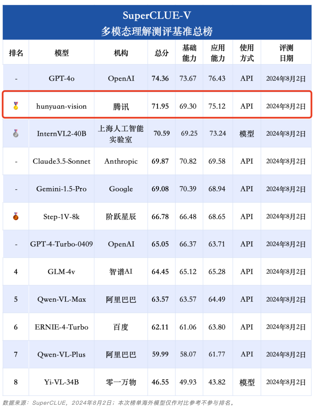 智东西8月2日消息,今日,中文多模态大模型SuperCLUE-V基准8月榜单发布,测评涵盖了国内外最具代表性的12个多模态理解大模型,包含4个海外模型和8个国内代表性多模态模型,评估内容包含基础能力和应用能力,以开放式问题对多模态大模型进行评估。腾讯混元大模型在多模态基础能力和应用能力方面获得总分71.95的高分,斩获国内大模型排名第一,稳居卓越领导者象限。