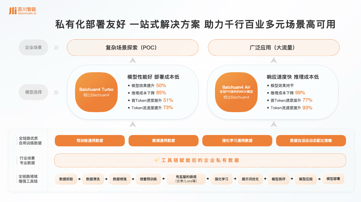 智东西10月31日消息,今天,百川智能推出一站式大模型商业化解决方案,即1+3产品矩阵(全链路优质通用训练数据,Baichuan4-Turbo、Baichuan4-Air两款模型和全链路领域增强工具链),该方案支持企业将专有数据与百川智能自用的全链路训练数据混合,对Baichuan4-Turbo、Baichuan4-Air两款模型进行调优和增强,实现了96%多场景可用率。