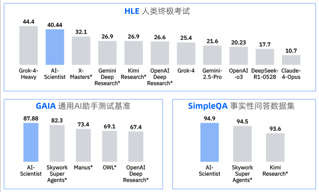 AI-Scientist在全球权威通用智能体测试中取得GAIA与SimpleQA双榜全球登顶,HLE排名国内第一。