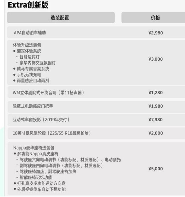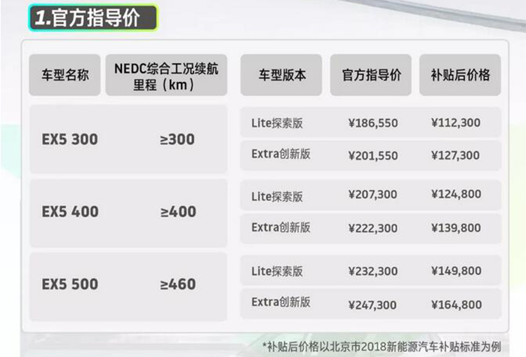 9月10日,威马汽车正式对外公布EX5量产车型价格区间为18.65万—24.73万,以北京市2018年国家新能源汽车补贴标准为例,售价区间为11.23万—16.48万。同时公布了EX5的选装配置价格。威马EX5全系车型采用VDA高能量密度方形电芯,电池包系统能量密度均超过140Wh/kg,标配6.6kW车载充电器,选配6.6kW双向车载充电器。威EX5将在9月12日停止预购,9月中旬开启整车定制的定金交纳工作,9月28日晚10时全面开放公众在线定制并启动交付。