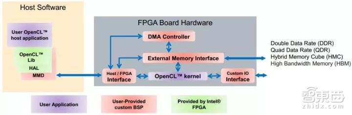 上图显示了一个定制化系统要支持OpenCL Flow所需的软件以及FPGA硬件支持。可以看出,对于一个用户定制化的SDK,在host系统端需要提前定义好内存映射,而在FPGA端则需要提供完整的数据通路以及控制通路,才能支持OpenCL Kernel的实时动态加载和运行。