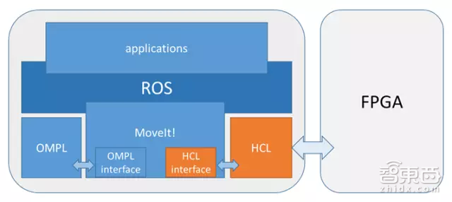 如上图所示,HERO平台采用MoveIt!作为运动规划的框架。OMPL是MoveIt!默认的规划算法库,也是开发基于采样的机器人运动规划算法的首选框架。它在规划过程中会通过虚函数接口调用MoveIt!提供的碰撞检测方法,而实际的碰撞检测则由HCL(HERO Collision Library)执行——这是专为HERO平台开发的具备FPGA加速功能的碰撞检测库,替换了MoveIt!原本使用的碰撞检测库FCL。为了充分发挥FPGA的性能,我们对OMPL和MoveIt!也做了修改,使之能够一次发起多个检测请求,从而减少CPU与FPGA交互的数量。最终针对自碰撞检测请求,HCL的处理速度达到了FCL的近两倍。
