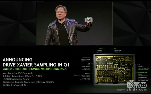 花费2000工程4年师心血打造的Xaiver采用12nmFFN工艺,内建90亿枚晶体管,基于一个特别定制的 8 核 CPU、一个全新的 512 核 Volta GPU、一个全新深度学习 加速器、全新计算机视觉加速器、以及全新 8K HDR 视频处理器而打造。并且,借助 NVIDIA 统一架构,所有早前 NVIDIA DRIVE 软件开发工作都得以持续进行。另外一个值得注意的细节是, Xaiver达到了ASIL-D的安全标准。