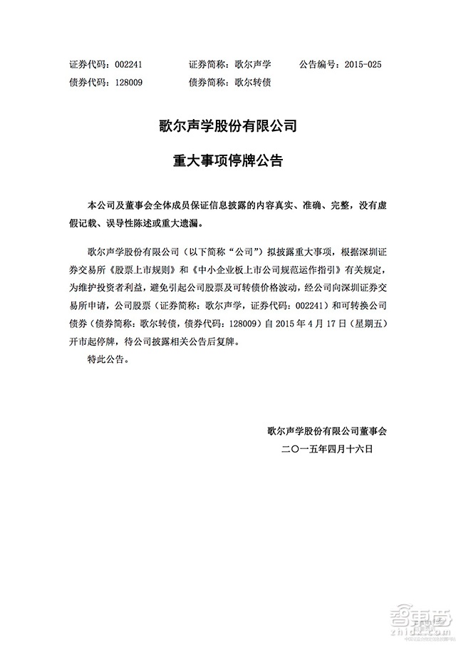 “歌尔声学股份有限公司(以下简称“公司”)拟披露重大事项,根据深圳证 券交易所《股票上市规则》和《中小企业板上市公司规范运作指引》有关规定, 为维护投资者利益,避免引起公司股票及可转债价格波动,经公司向深圳证券交 易所申请,公司股票(证券简称:歌尔声学,证券代码:002241)和可转换公司 债券(债券简称:歌尔转债,债券代码:128009)自 2015 年 4 月 17 日(星期五) 开市起停牌,待公司披露相关公告后复牌。