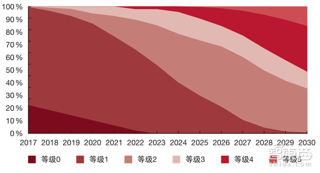 但是,从自动驾驶的角度来看,由于技术可用性较低和缺乏法律框架,目前自动驾驶汽车的发展正受到限制,道路上2和3级自动化水平的汽车少之又少。目前的假设是,即使技术上提前会有重大突破,4级自动化水平汽车的面市,最早也要到2022到2023年。到2030年,大部分车辆将被划分为2级和4级。