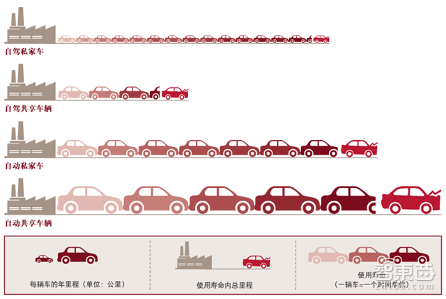 未来的自动性,尤其是共享自动性车辆在容量方面将实现重大改进,亦即,汽车年里程将大幅上升。年里程的增长和车辆总里程的减少,由此,汽车置换速度将会显著提升(虽然其有效的生命里程将增加)。