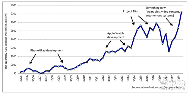 智东西3月19日消息,苹果分析师Neil Cybart在Above Avalon上发布对苹果过去几年研发费用支出的分析报告,该报告显示,苹果计划在2018财年在研发支出上花费总计140亿美元,这是苹果历史上最大规模的研发费用支出,是其在1998年至2011年间花在研发上的支出总额。