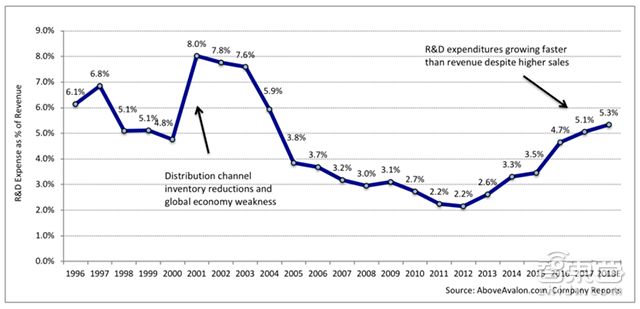 从附录3我们可以看到,苹果研发支出占收入的百分比目前处于14年来的最高水平。这意味着,尽管多年来销售额大幅增长,但苹果公司在研发上的投入更多。对于有些公司来说,这可能并不意味着什么,但对于苹果公司来说,它是不可忽视的。