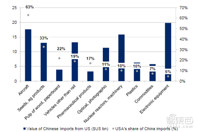 ▲飞机和农产品是中国从美国进口的主要产品(援引高盛)