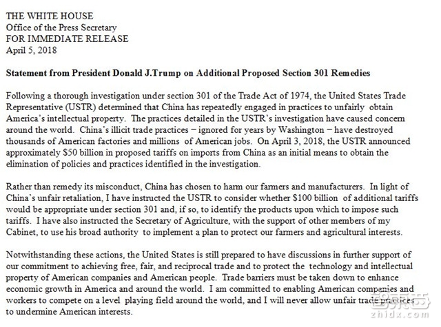 当地时间4月3日,美国贸易代表办公室(USTR)根据“301调查”公布了拟加征关税的中国商品清单,涉及每年从中国进口的价值约500亿美元约1300种商品,主要针对航空航天、信息和通信技术、机器人、医药和机械等行业。