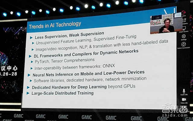 他还谈论了增强学习在游戏中有很好的表现,但是由于需要大量实验才能够完成一个任务,并且需要上百个小时的学习,因此在现实世界并不那么实用。他还强调AI的核心在于预测,而AI的下一个变革在于无监督学习、常识学习。