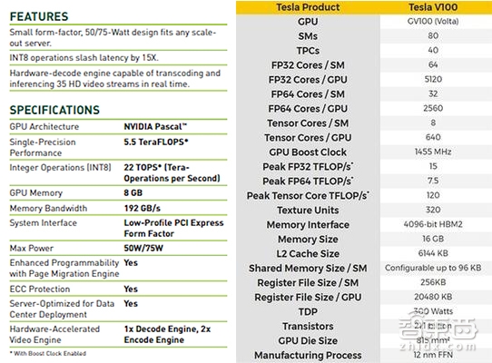 ▲左:英伟达2016年发布的Tesla P4参数,右:英伟达2017年发布的Tesla V100参数,