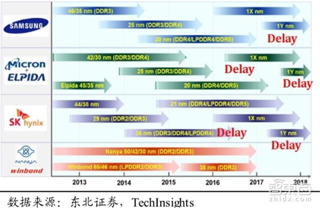 目前,三星已大规模采用20nm工艺,并率先量产18nm工艺;SK海力士则以25nm工艺为主,已导入21nm工艺;美光目前以30nm工艺为主,20nm工艺进入良率提升阶段。