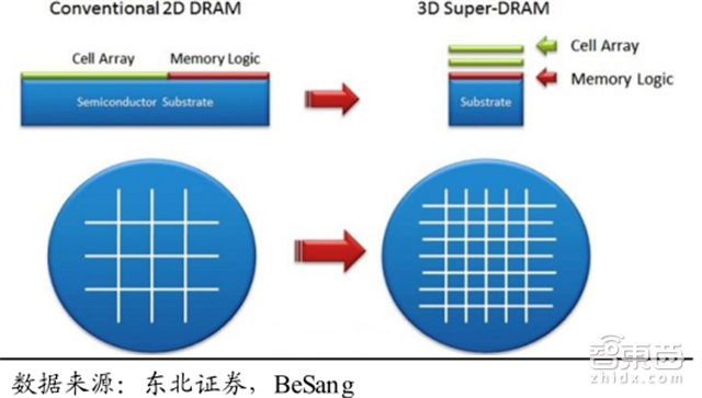 3D DRAM技术,或者说3D封装,采用TSV将多片芯片堆叠在一起,能够在宽松尺寸下实现高密度容量,并减少寄生阻容和延时串扰问题。随着电子产品对DRAM容量要求和性能的提升,未来3D DRAM比重将呈上升趋势。