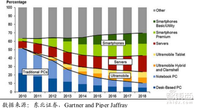 ▲2010-2018 DRAM产品份额及预测:预计到2018年,移动终端和服务器消费份额将继续增长,PC 消费将继续下降,到达历史最低点
