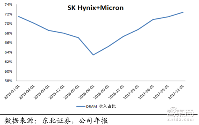 IHS Markit发布数据显示,2017年三季度,韩国半导体行业两大巨头三星(44.5%)和SK海力士(27.9%),在全球DRAM市场份额合计达到72.4%,美光科技(22.9%)、南亚科技(2.2%)、华邦电子(0.8%)分列其后。