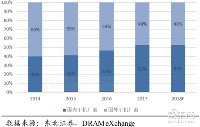 移动终端方面,DRAM在手机中的平均存储容量保持在每年10%-20%的增长速度,结合手机市场的增长(每年15亿台的稳定换机周期),预计2018年移动终端的DRAM需求将增长18.7%,并继续向国产机品牌集中。