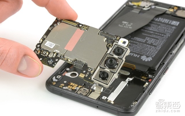 相比于其他安卓手机,华为设计了更小的主板和更宽的电池。这三个摄像头被设计成了一个模块,并紧紧地连接在主板上,而且闪光灯模块也被拖拽着。后置的三摄只设计了两条排线,其中,主摄像头与黑白摄像头共享一条排线,而长焦摄像头则拥有一条单独的排线。