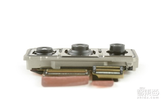 从侧面看,可看到这三个摄像头的厚度,左边的是2000万黑白摄像头,中间的是4000万广角摄像头,右边的是800万长焦摄像头。