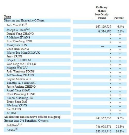日前,阿里巴巴日前向SEC(美国证券交易委员会)提交了 20-F报告。报告中披露了阿里最新股权结构,阿里高管和董事合计持股降至9.5%。如图所示,截至今年7月18日,阿里董事局主席马云持股6.4%,阿里执行副主席蔡崇信持股2.3%,阿里高管和董事合计持股9.5%,都有所下降。软银集团持股28.8%,Altaba持股14.8%。Altaba是雅虎核心业务出售给美国运营商Verizon后,更改的新名字。