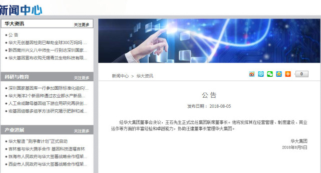 8月5日,华大集团公告称,经华大集团董事会决议,王石先生正式出任集团联席董事长,将协助汪建董事长管理华大集团。8月4日晚间,王石发布微博及朋友圈称:“人生旅途无限风光在险峰,华大2018年年会上,经华大集团董事会批准,我为华大集团董事会联席董事长。”