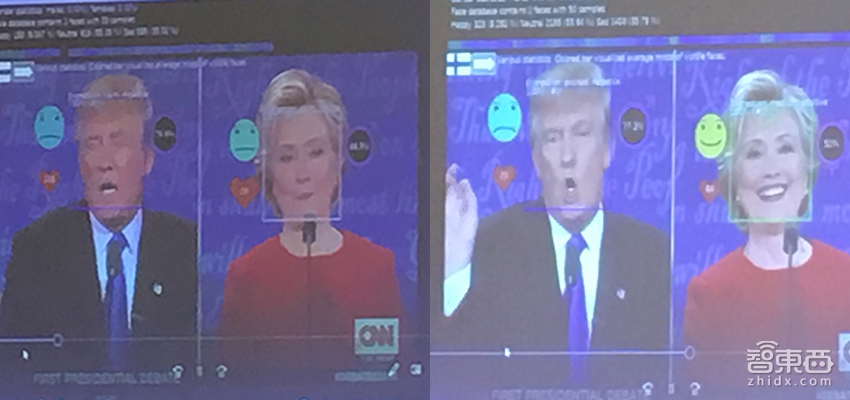 除了介绍相关算法外,Matti Pietikainen还展示了这些研究的一些应用场景,并分享了几个有趣的实例视频。比如机器可以在川普和希拉里的竞选视频中根据两人的动态表情变化实时分析出他们在那一刻的心情。