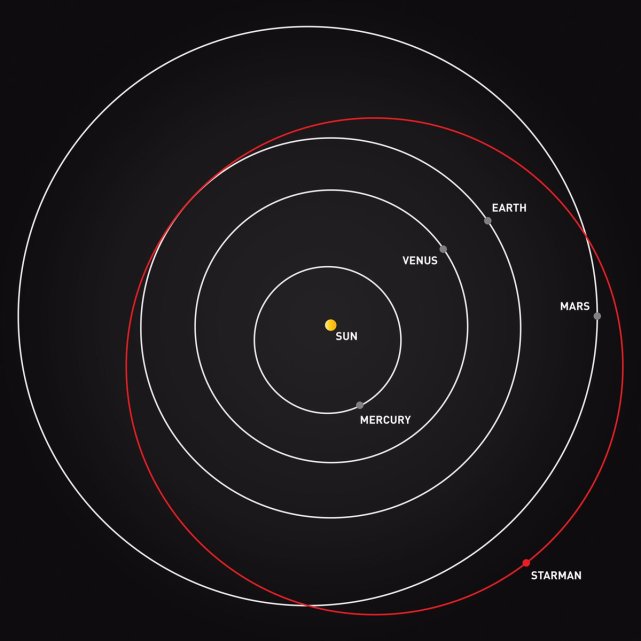 据外媒报道,在过去9个月中,太空探索科技公司SpaceX的假人Starman已坐在他的特斯拉Roadster跑车里行驶了很远的距离。SpaceX公司发言人在周五晚上宣称,这辆红色的电动汽车及其穿着太空服的假人司机现在已飞到了火星轨道之外。周五,SpaceX在微博网站Twitter上发推文称,“这是Starman假人的当前位置。下一站,宇宙尽头的餐馆。”还配上了一张轨道图。
