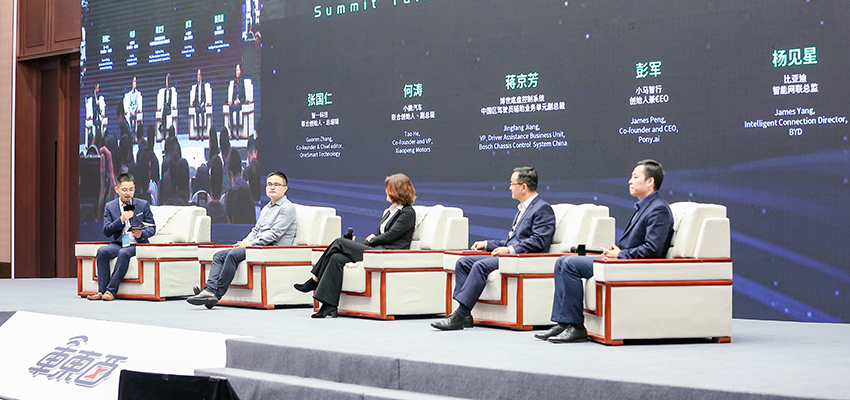 峰会期间,以“智能汽车的未来十年”为题,智一科技联合创始人、总编辑张国仁,小鹏汽车联合创始人、副总裁何涛,博世底盘控制系统中国区驾驶员辅助业务单元副总裁蒋京芳,小马智行联合创始人兼CEO彭军,比亚迪智能网联总监杨见星这五位智能汽车产业媒体、车企、Tier1、出行服务领域的领军人物参与了此次巅峰对话。