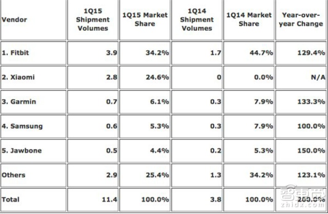 而现在,不仅是小米手机,当小米被炒作为“国民手机”品牌之时,小米手环也让小米成了世界第二大可穿戴设备生产商。据IDC最新数据(下图)显示,小米利用不到一年的时间成了可穿戴设备行业的老二,排名领先于已经推出六款可穿戴设备的三星,仅次于早在2009年就开始布局可穿戴被行业的Fitbit。值得注意的是,这个报告并未统计Apple Watch。