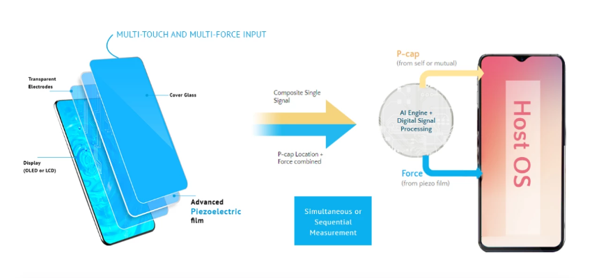 这个配件主要由一块薄膜式的压力传感器和透明电极构成,它们组合起来能够完成触压位置的感应。透明电极中配备有AI引擎,在它的支持下,该电极才能够快速感应到触摸信号和压力信号,而这个过程无需其他外部元件。