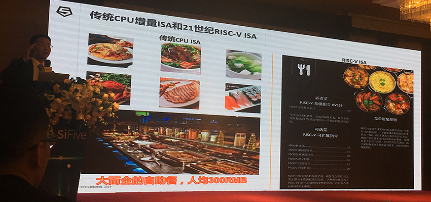 SiFive中国区业务发展总监陈卫荣以吃为例,将传统CPU增量ISA和21世纪RISC-V ISA分别比喻为自助餐和可增加新品的菜单。