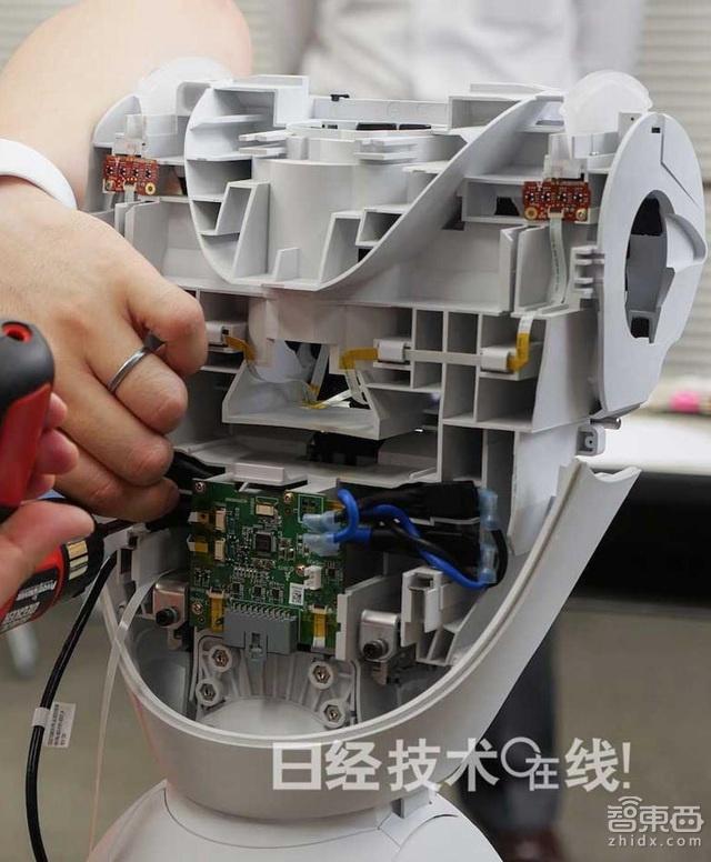 从覆盖Pepper表面的外装部件上几乎看不到螺丝。基本都是利用里面的卡榫,在内部进行固定的,覆盖头顶的面板状部件也不例外。