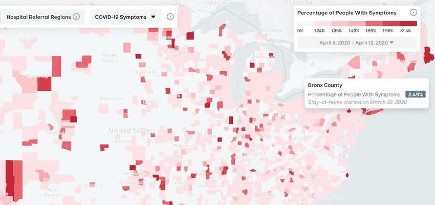 智东西4月21日消息,昨日,Facebook 与卡内基梅隆大学(CMU)合作,推出了一张可追踪患者症状的热力地图,帮助人们及时了解新型冠状病毒肺炎疫情在美国各地的传播情况。