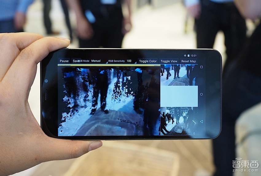 最后,工作人员拿出了一把改装过的 NERF 软弹枪(手机被装在里面)。这次示范的是一个名叫 Tango Blaster 的第一人称射击游戏,攻击敌人的方法其实没什么特别,但得益于运动追踪和距离测算技术,你可以真的跑到墙壁后面去寻找掩护,而且移动枪口便能找到周围的射击目标。