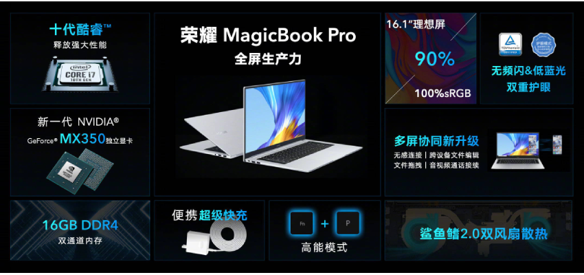 MagicBook Pro搭载第十代英特尔酷睿i7处理器,采用NVIDIA GeForce MX350独立显卡,拥有16GB DDR4双通道大内存,性能提升25%。散热方面,采用鲨鱼鳍2.0风扇散热。
