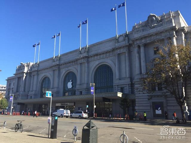 苹果只对这地做了简单的装饰,中间挂了一个大大的苹果Logo,底下几个橱窗装饰了这次发布会的海报,门口路灯杆上有一些小海报,像是Siri的标示,仅此而已。