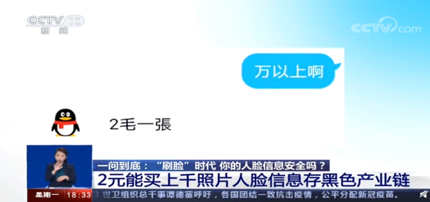央视报道,一些人脸信息被App运营方、技术开放商泄露,造成人脸信息被滥用,甚至生成了黑色产业链。
