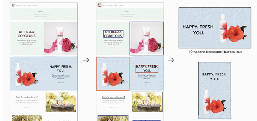 URL2Video会在每个网页中提取文档对象模型信息和多媒体资料,将视觉上可区分的内容标记为视频中的可用元素,包括标题、产品图片、文字说明和外链等。