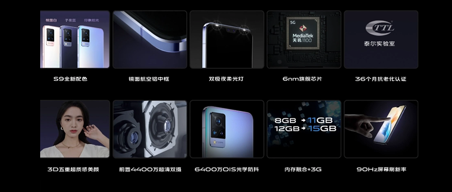 这次vivo S9首发了联发科天玑1100 6nm 5G SoC,逻辑密度提升了18%,CPU内具有四颗A78内核,主频为2.6GHz,GPU则搭载了九颗Mali-G77内核。