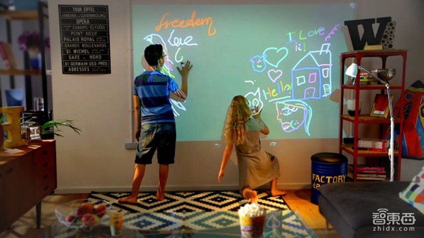 Parham他们最近在旧金山南部市场街区租了一个Airbnb公寓来展示Bird怎么在各种工作或娱乐的场景里方便地使用。他把一个大投影演示变成了触屏风格的环境,可以在空中敲一下就能翻页。之后还展示了一个更有趣的应用,Parham戴上多个Bird直接打了一局多人版的水果忍者。