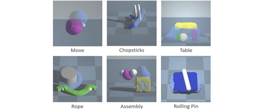 在PlasticineLab中,机器人通过模拟操纵各种柔软的物体来感知学习如何完成一系列特定的任务。擀面杖测试中,目标是让机器人通过按压或滚动擀面杖压平一块面团;绳索测试中,是要机器人完成将绳子缠绕到柱子上;在筷子测试中,是要机器人用筷子夹起一根绳子并移动到目标位置。