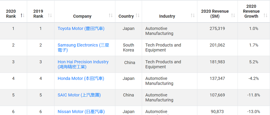 收入排名前十的有丰田、本田、上汽、日产和现代5家汽车制造商,三星电子、鸿海精密(富士康)和日立等三家科技产品/设备供应商,以及索尼和松下两家消费电子供应商。