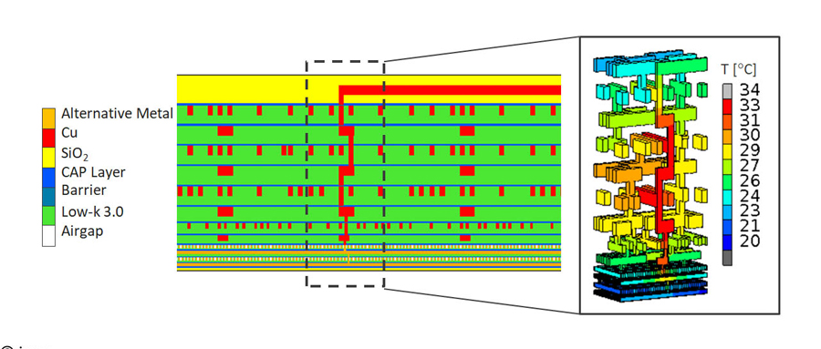 IMEC通过在局部2层金属互连层上进行焦耳热“校准”测量,并通过建模将结果投射到12层后端连线(BEOL)结构上,从而量化了这个难题。该研究预测,气隙会使温度升高 20%。研究也发现金属线的密度起着重要作用,较高的金属密度显示有助于减少焦耳热。