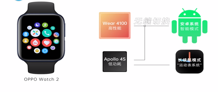 当用户使用亮屏、监测睡眠等基础功能时,OPPO Watch 2会优先运行以Apollo 4s芯片为核心的轻量化RTOS系统。当用户需要通过手表运行一些软件应用时,OPPO Watch 2将会优先选择以高通Wear 4100处理器为核心的安卓系统。