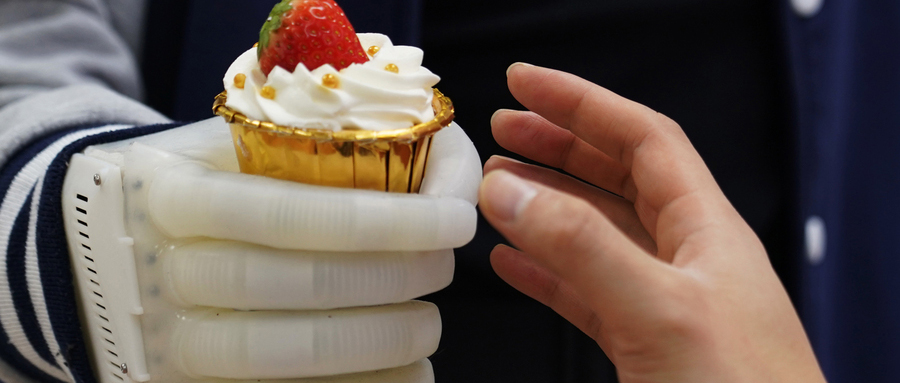 一名志愿者用上EcoFlex之后能够在日常生活中轻松的使用它,比如可以用来吃饼干、蛋糕、苹果等食物,也能使用笔记本电脑、瓶子、锤子、钳子等工具,甚至还能与人握手和“撸猫”。