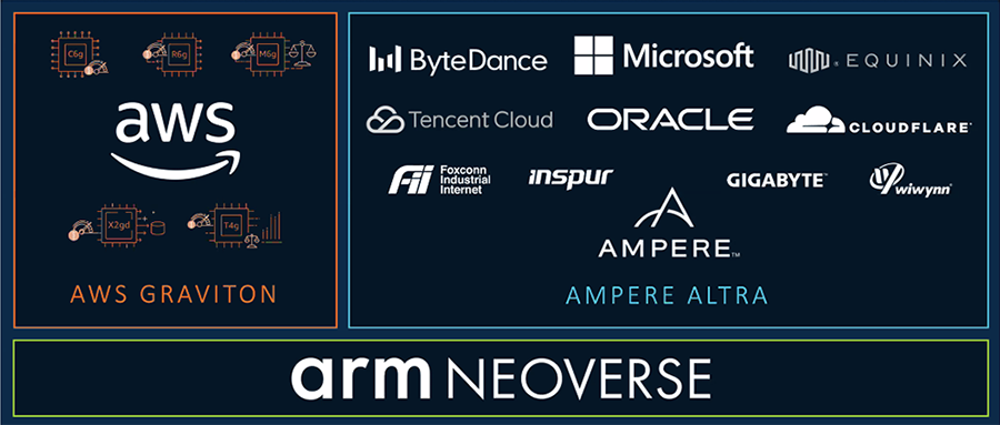 Arm Neoverse已经积极拥抱国内外云服务提供商们。例如亚马逊AWS Graviton服务器处理器、安晟培半导体(Ampere Computing)的云原生处理器产品等均采用Neoverse处理器IP核。